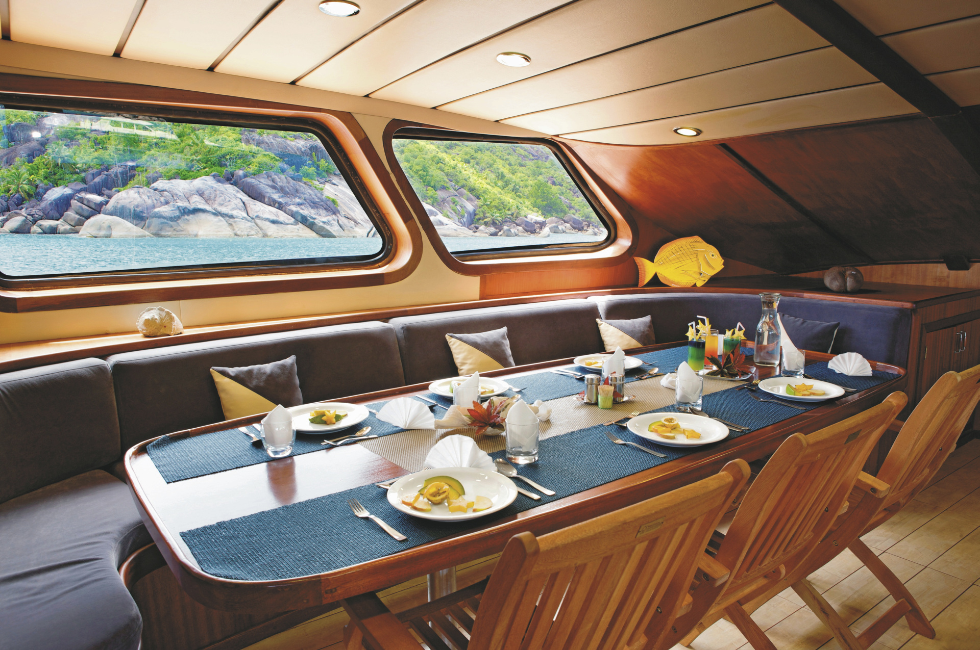 Die S.Y. Sea Star & S.Y. Sea Bird sind vollausgestattete Yachten mit je 9 Doppelkabinen (buchbar mit privatem Bad). Die Katamarane sind ca 40 Meter lang und ca 8 Meter breit. Alle Kabinen und der Salon sind mit einer Klimaanlage ausgestattet. Über das traditionelle technische Equipment steht den Gästen TV, CD- und DVD-Player und eine voll ausgestattete Küche zur Verfügung. Handtücher und Bettwäsche werden zur Verfügung gestellt. Betreut werden Sie durch die acht- bis neunköpfige Crew bestehend aus Kapitän,