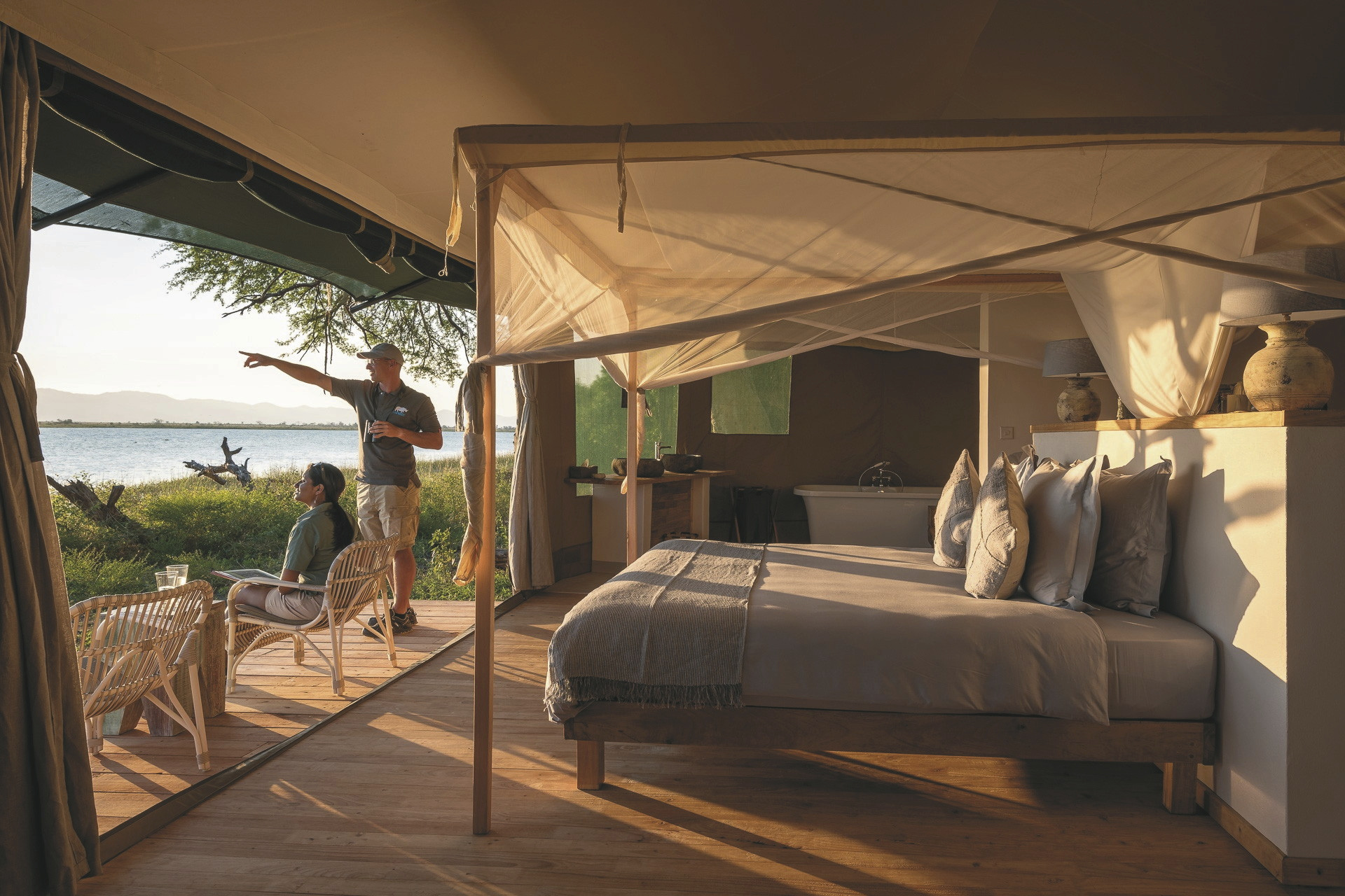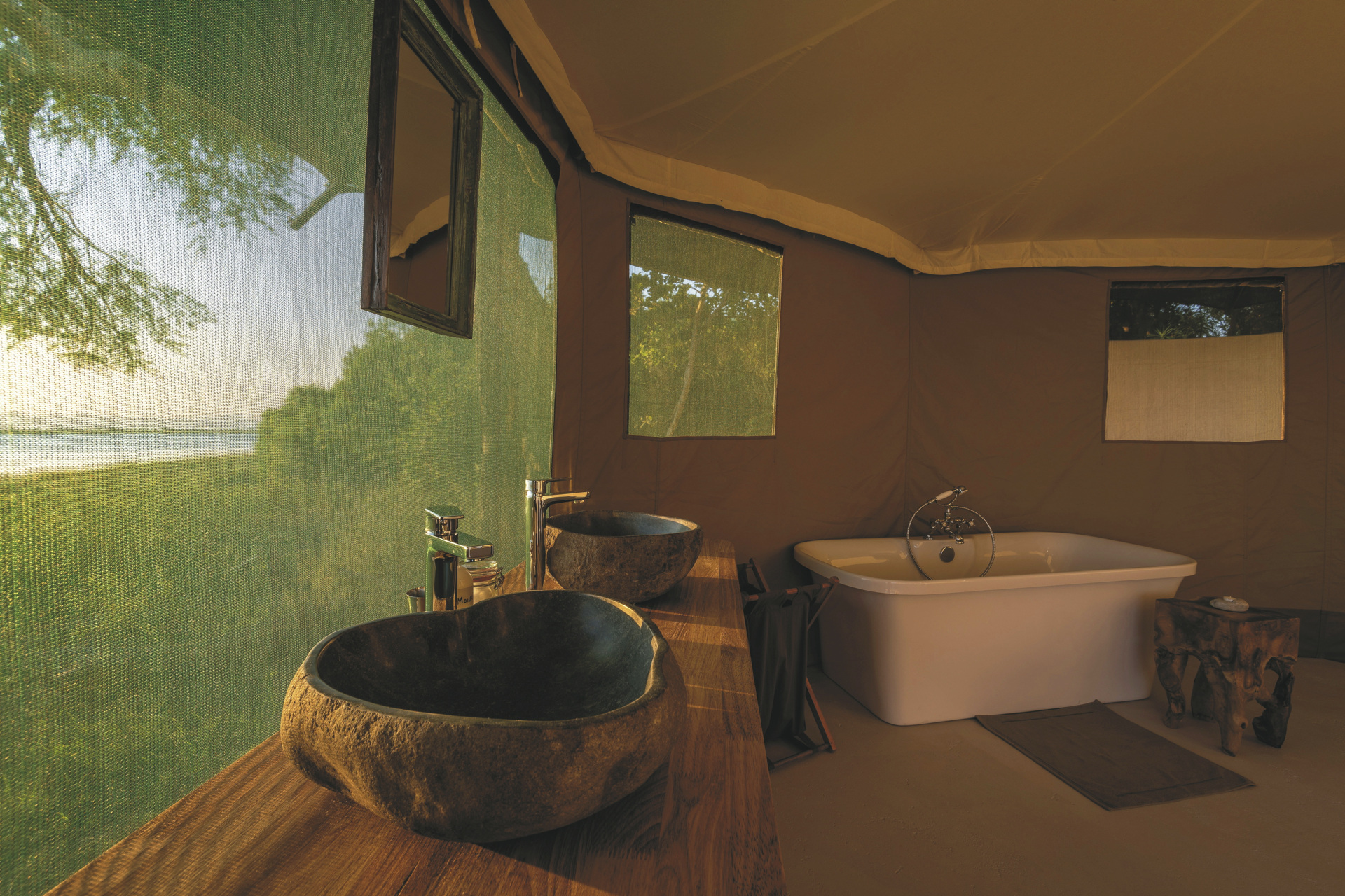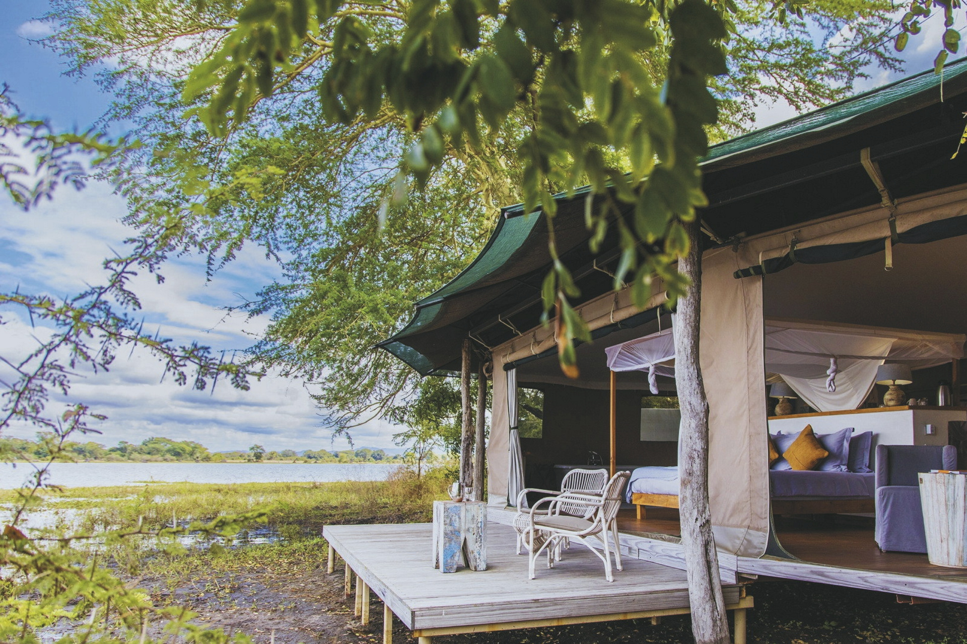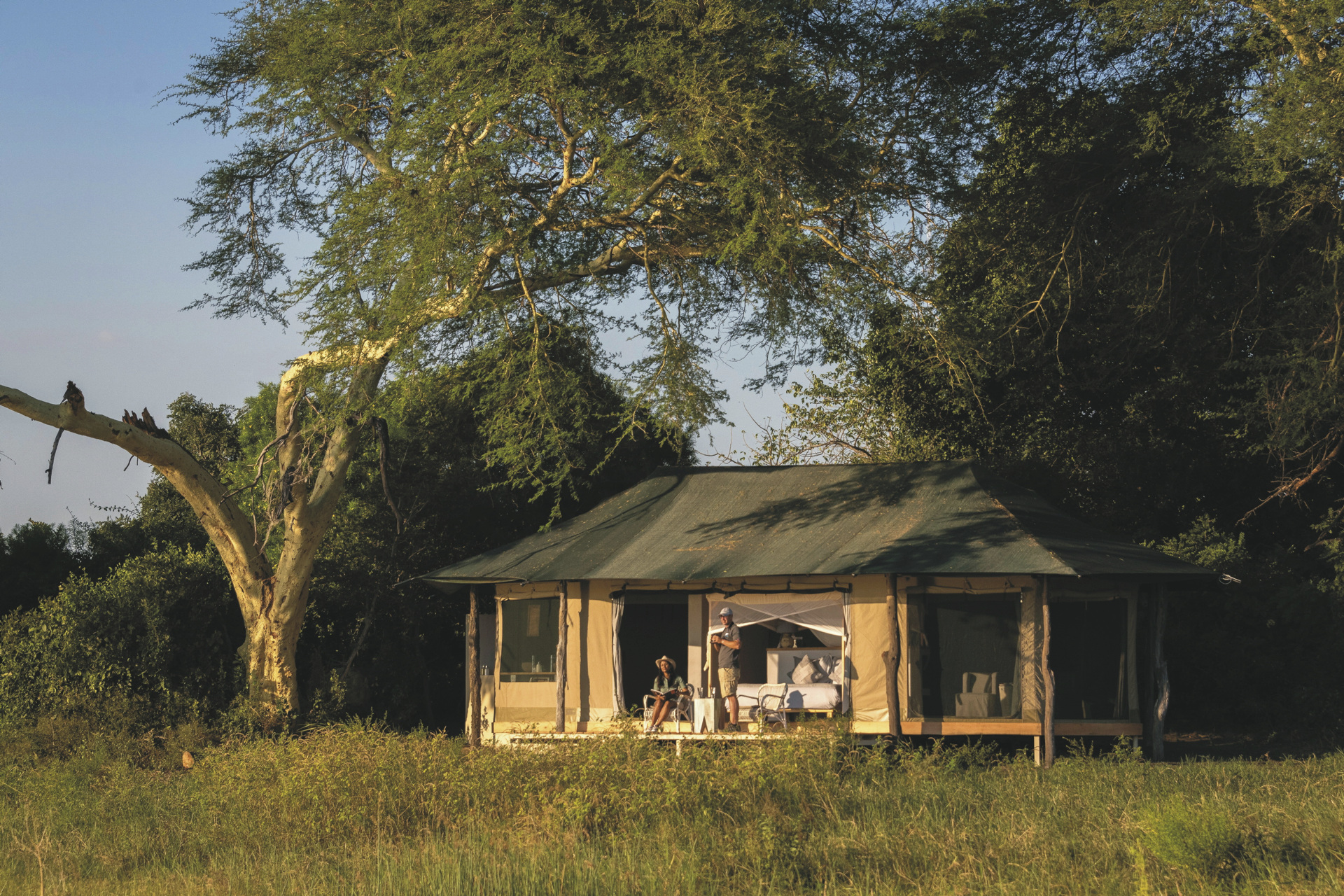 Ebenfalls ganz nah am Flussufer befinden sich die 5 großen, modernen Safarizelte. Jedes verfügt über ein eigenes offenes Bad mit Außendusche; Moskitonetz, Loungebereich und Terrasse mit herrlicher Aussicht über die Flusslandschaft. Das Bett ist mit einem Evening Breeze System ausgestattet, das effizient nur das Bett, jedoch nicht das komplette Zelt am Abend kühlt. Für den Kontakt zu den Lieben nach Hause finden Sie in Ihrem Zelt auch kostenfreies WLAN. Für Familien gibt es die Möglichkeit Kinder auf zwei Zustellbetten im Zimmer unterzubringen.
