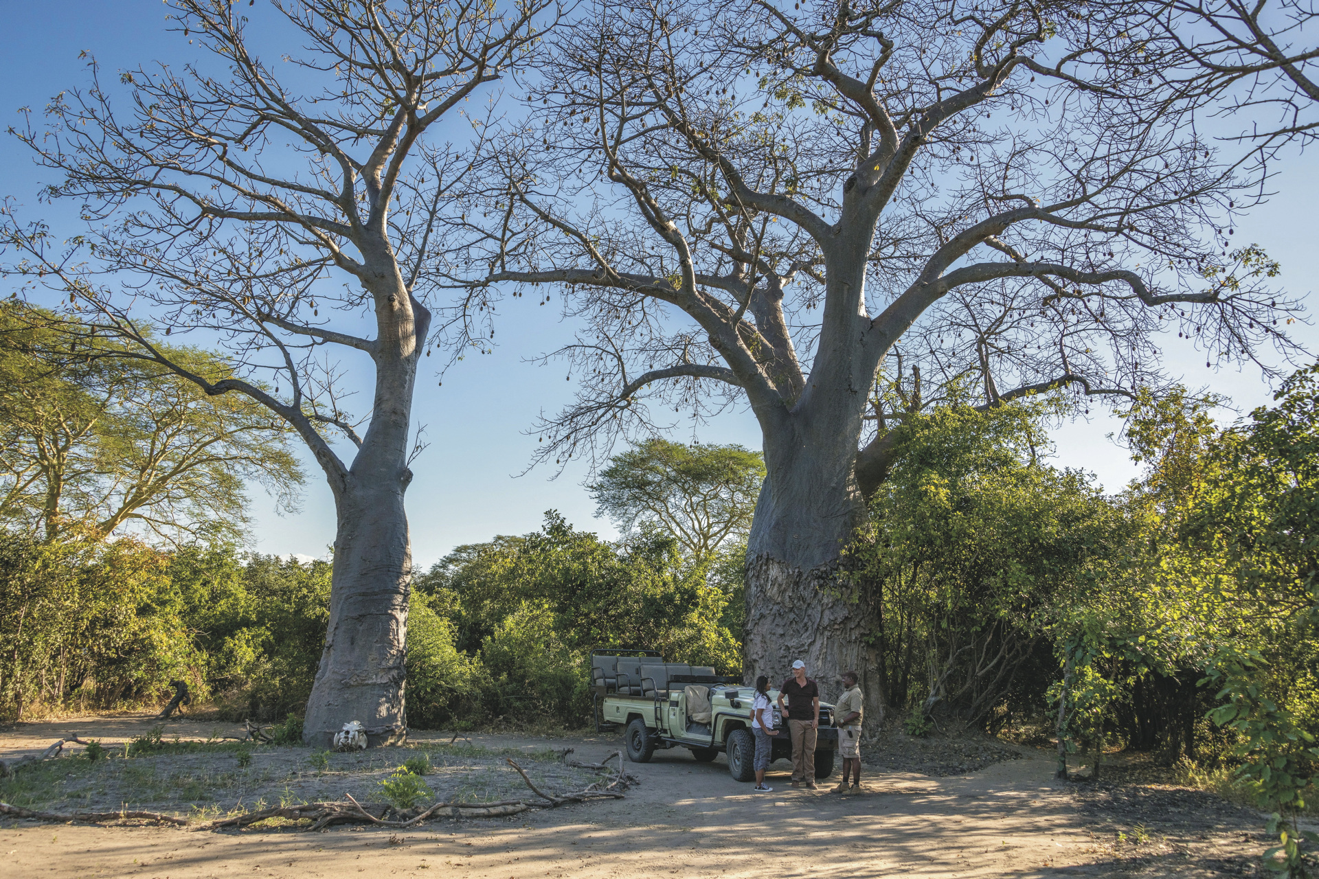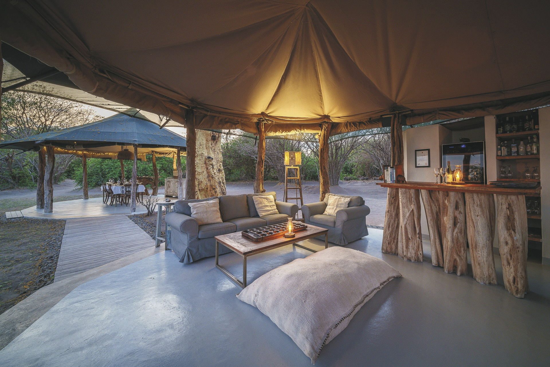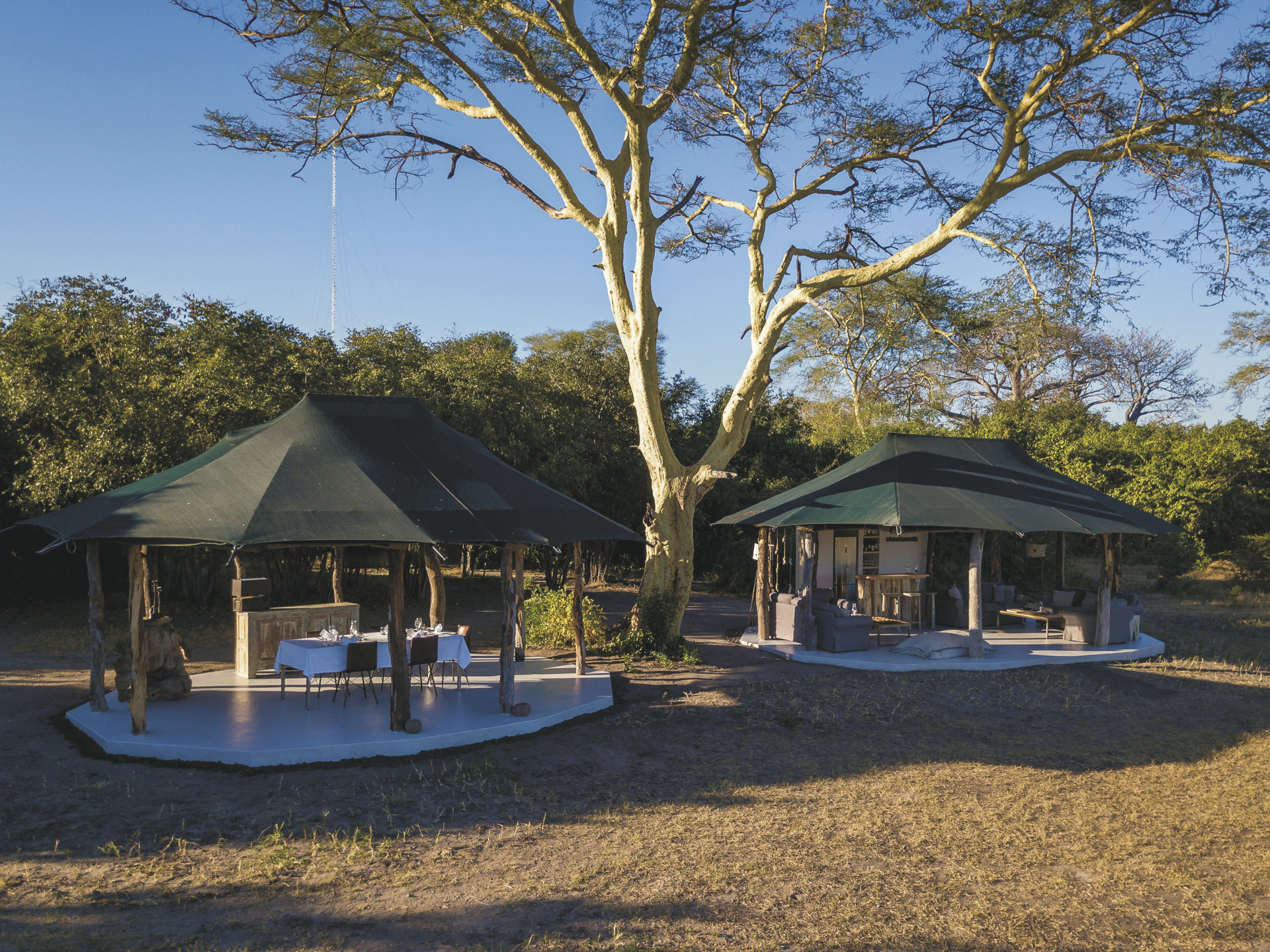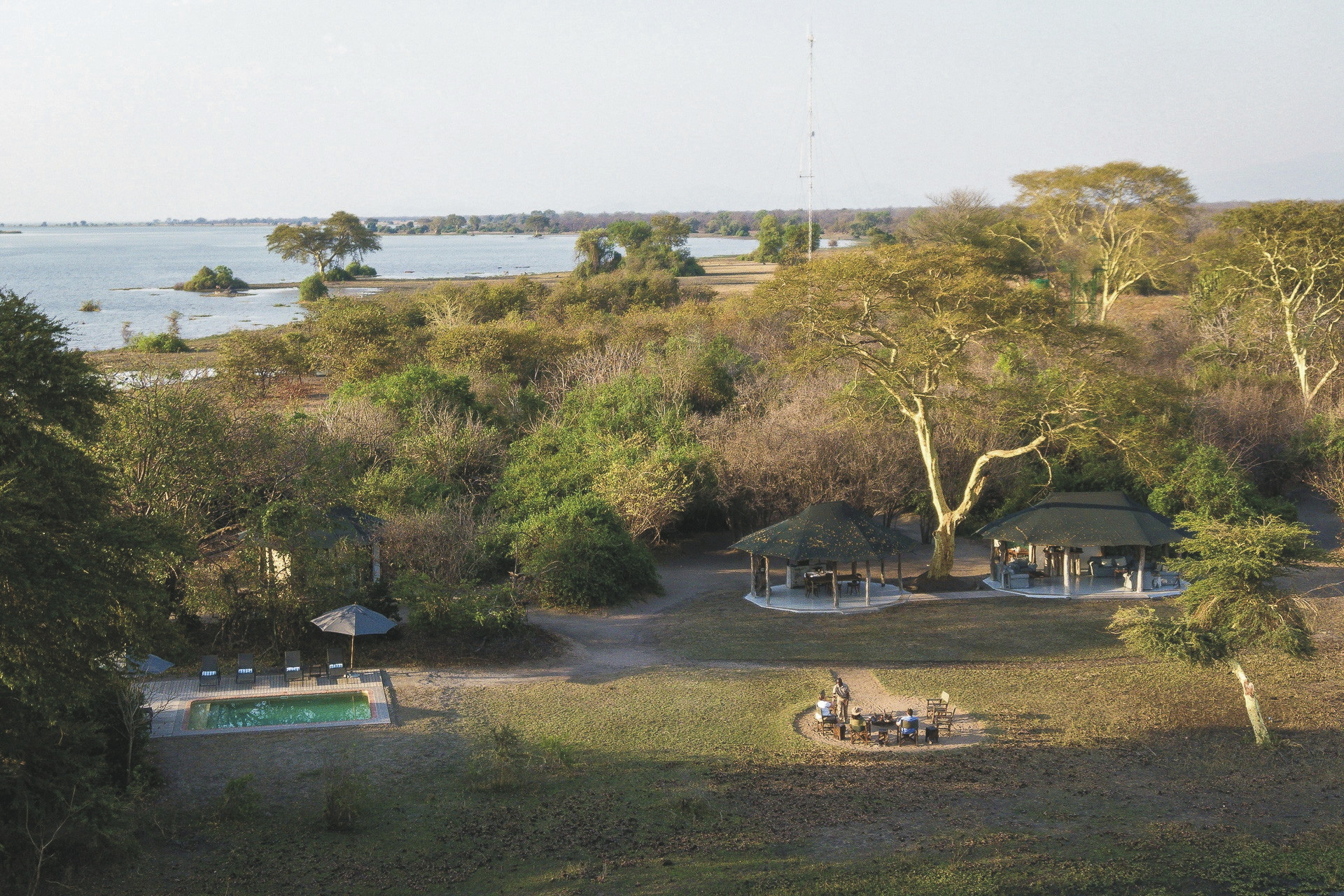 Das nicht eingezäunte Camp ist wunderschön zwischen Baobas und Fieberbäumen eingebettet, der Blick wird immer auf den vorbeiziehenden Fluss gelenkt. Häufig kommt das Wild ganz nah. Im zentralen Bereich gibt es zwei offene Zelte. Eines fungiert als Speisezimmer, das andere, gemütlich mit Sofas und Sesseln eingerichtet, steht als Bar- und Loungezelt zur Verfügung. Am Abend trifft man sich rund um das Lagerfeuer zum gemütlichen Plausch und zur Sternenbeobachtung. Zwischen den Safari-Aktivitäten kann man vom kleinen Pool das Wild am Fluss beobachten. Das Camp wird über Solarenergie und einen Notfallgenerator betrieben. Eingeschlossene Aktivitäten: Pirsch- und Bootsfahrten, geführte Buschwanderungen.