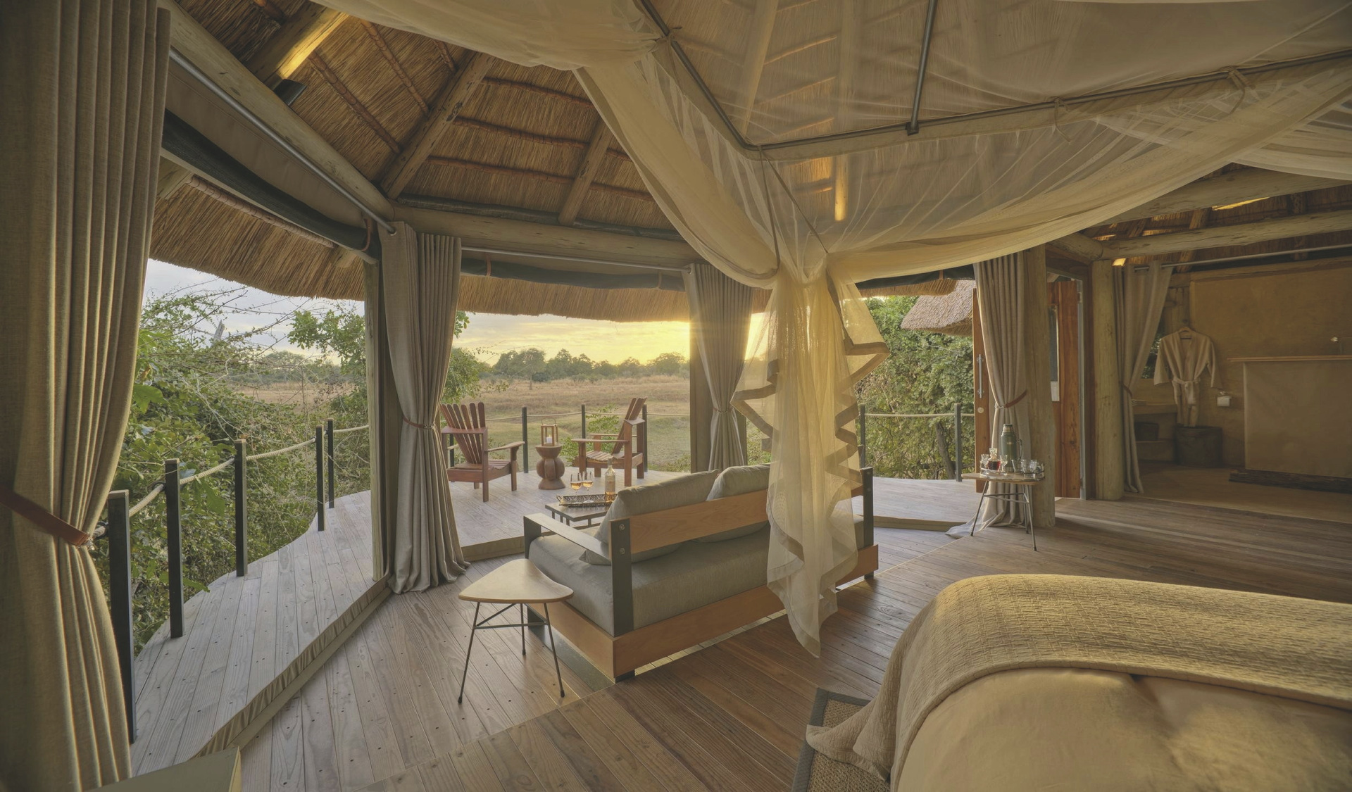 Die zehn großzügigen Suiten des Lion Camps sind auf erhöhten Holzplattformen gebaut und fügen sich harmonisch in die Umgebung ein. Mit natürlichen Materialien und warmen Farben gestaltet, bieten sie ein angenehmes Wohngefühl mitten in der Wildnis. Jede Luxus-Suite verfügt über ein eigenes Badezimmer mit Dusche und WC sowie eine private Terrasse mit Sitzbereich. Große Canvas-Fenster eröffnen den Blick auf die Lagune und die vorbeiziehende Tierwelt.
