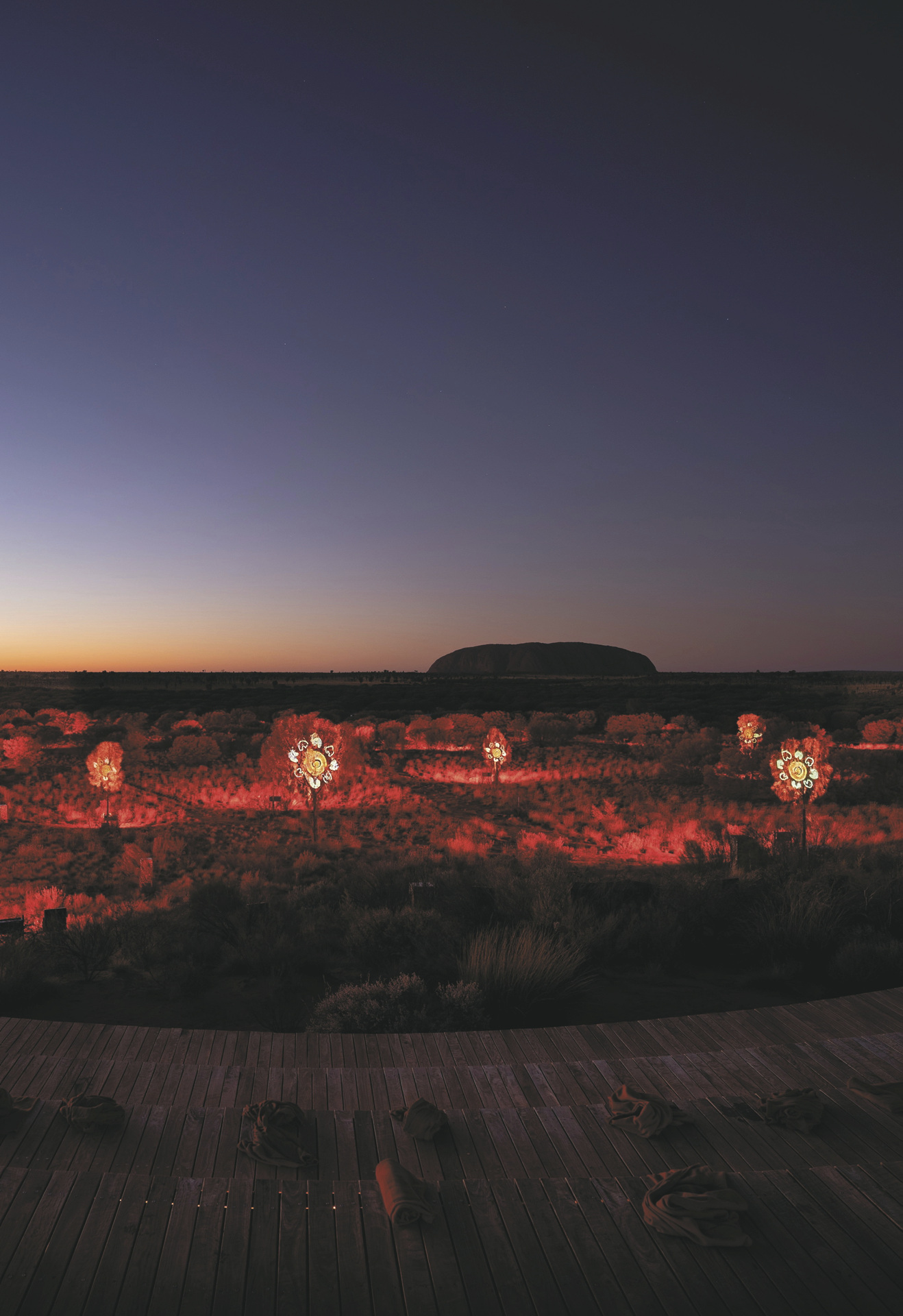 Sunrise Journeys rückt drei produktive Anangu-Künstlerinnen ins Rampenlicht, die sich zusammengetan haben, um ein maßgeschneidertes Kunstwerk zu schaffen, das ihre tiefe Verbindung zur Kultur und zum Land darstellt. Bevor sich die leuchtenden Silhouetten von Uluru und Kata Tjuta offenbaren, wird das Kunstwerk zum Leben erweckt, wobei die weite Wüstenlandschaft als natürliche Leinwand genutzt wird.Während sich die rote Erde unter der aufgehenden Sonne erwärmt, nehmen die Gäste auf der nachhaltig gebauten Plattform mit Blick auf Uluru und Kata Tjuta Platz und beobachten, wie das Kunstwerk mit modernster Laser- und Lichtprojektionstechnologie auf der weiten, dunklen Wüstenlandschaft darunter nachgebildet wird. Indigene Symbolik – ähnlich wie sie häufig in Punktmalereien zu sehen ist – beginnt sanft über das Land zu fließen.