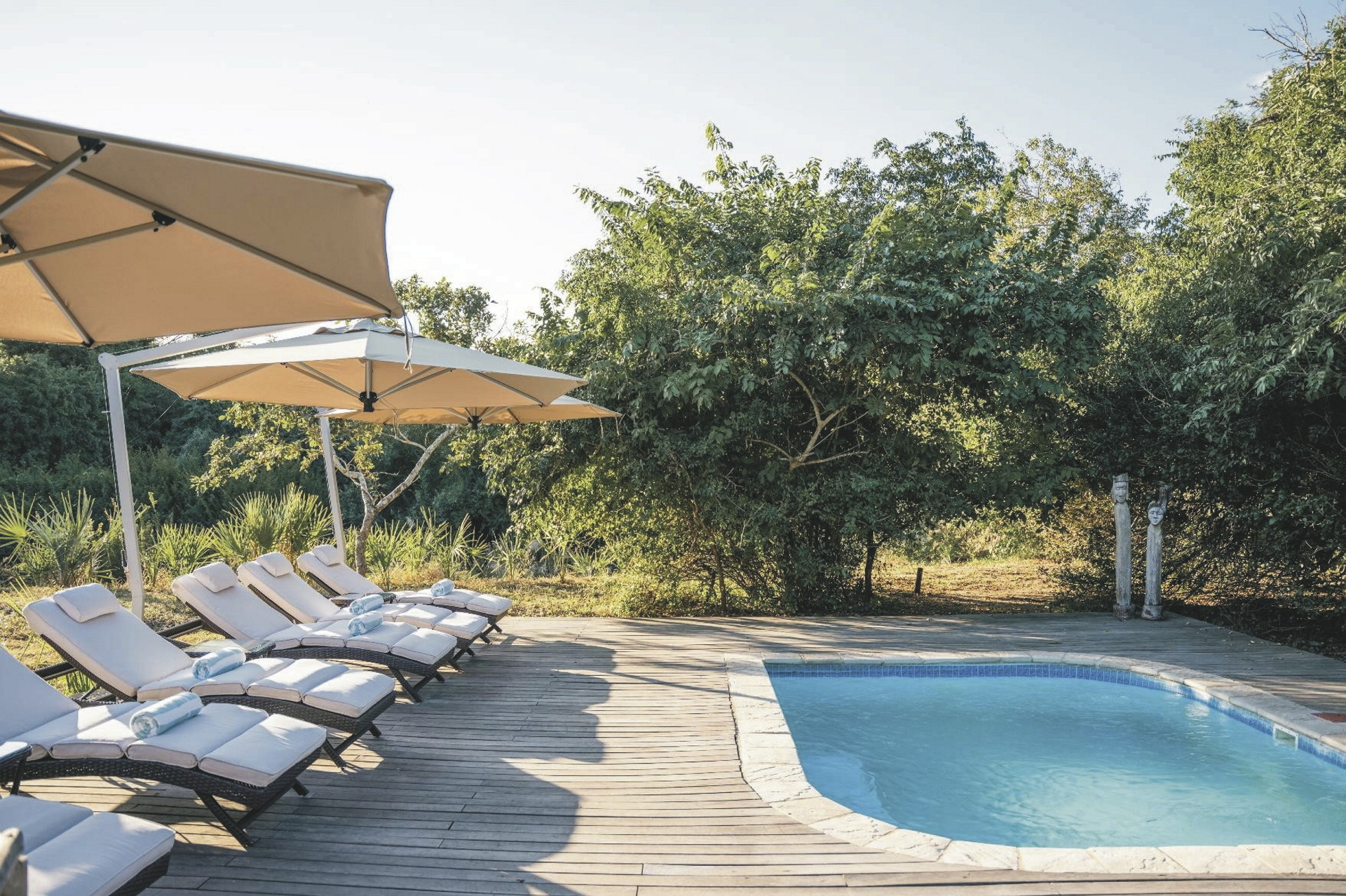 Schon früh, wenn die Sonne gerade über den Horizont schaut, treffen Sie sich zu einem schnellen Heißgetränk und einem Snack mit den anderen Gästen und starten dann zur Pirschfahrt. Beobachten Sie den Busch und seine tierischen Bewohner beim Start in den Tag und erleben Sie einen den unberührtesten Nationalparks des Südlichen Afrikas hautnah. Ein ausgiebiges Frühstück erwartet Sie nach der Rückkehr. Genießen Sie die Zeit zwischen den Safariaktivitäten mit einem guten Buch am Pool oder auf der Terrasse mit Blick in den Busch oder auf den Fluss. Am späten Nachmittag geht es erneut auf Safari. Nach Einbruch der Dunkelheit kehren Sie zum Camp zurück und genießen ein herrliches Abendessen. Noch ein Plausch am Lagerfeuer bevor sich alle früh zu Bett begeben. Morgen startet ein neuer aufregender Tag mit vielen tierischen Begegnungen.