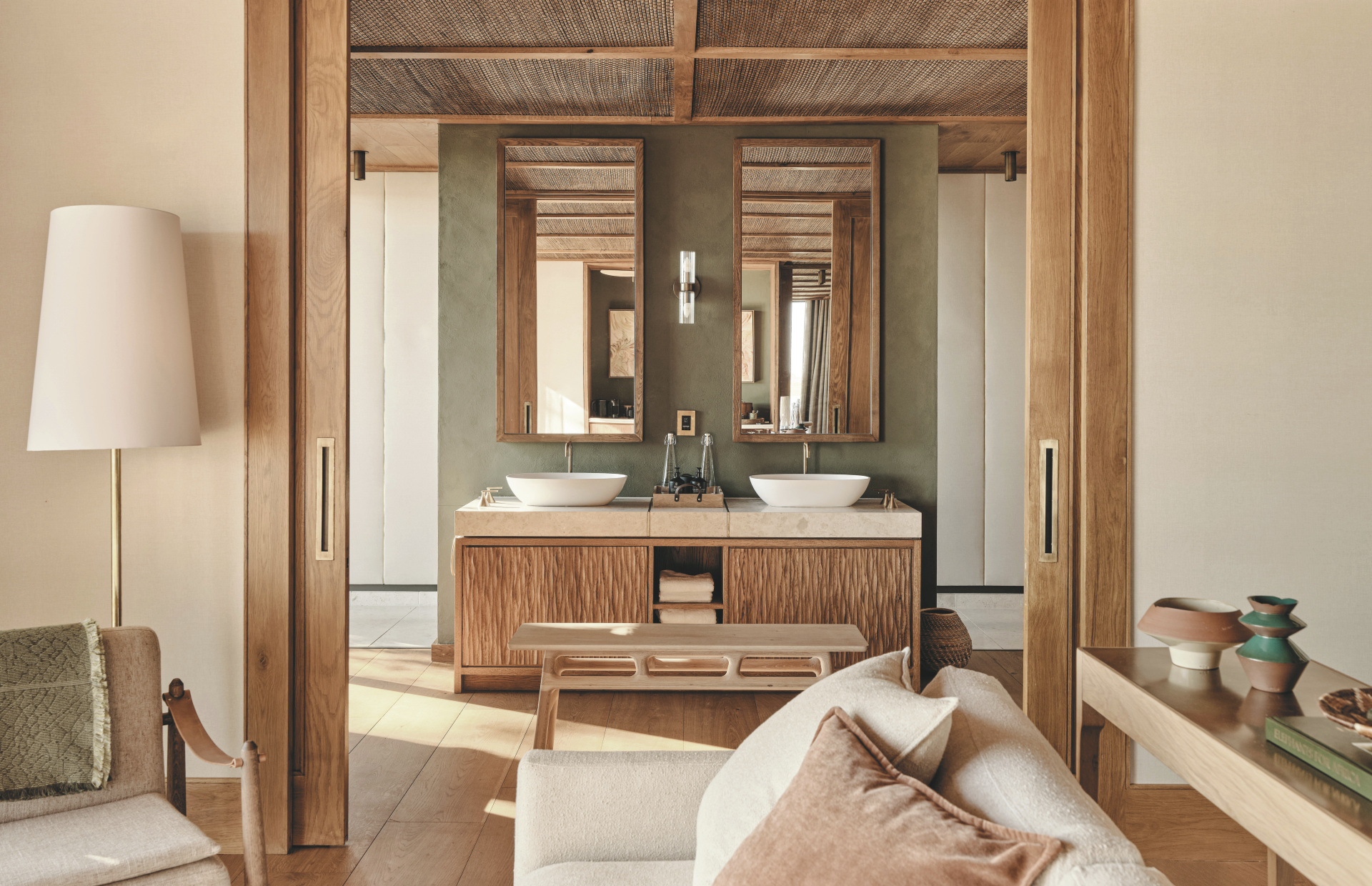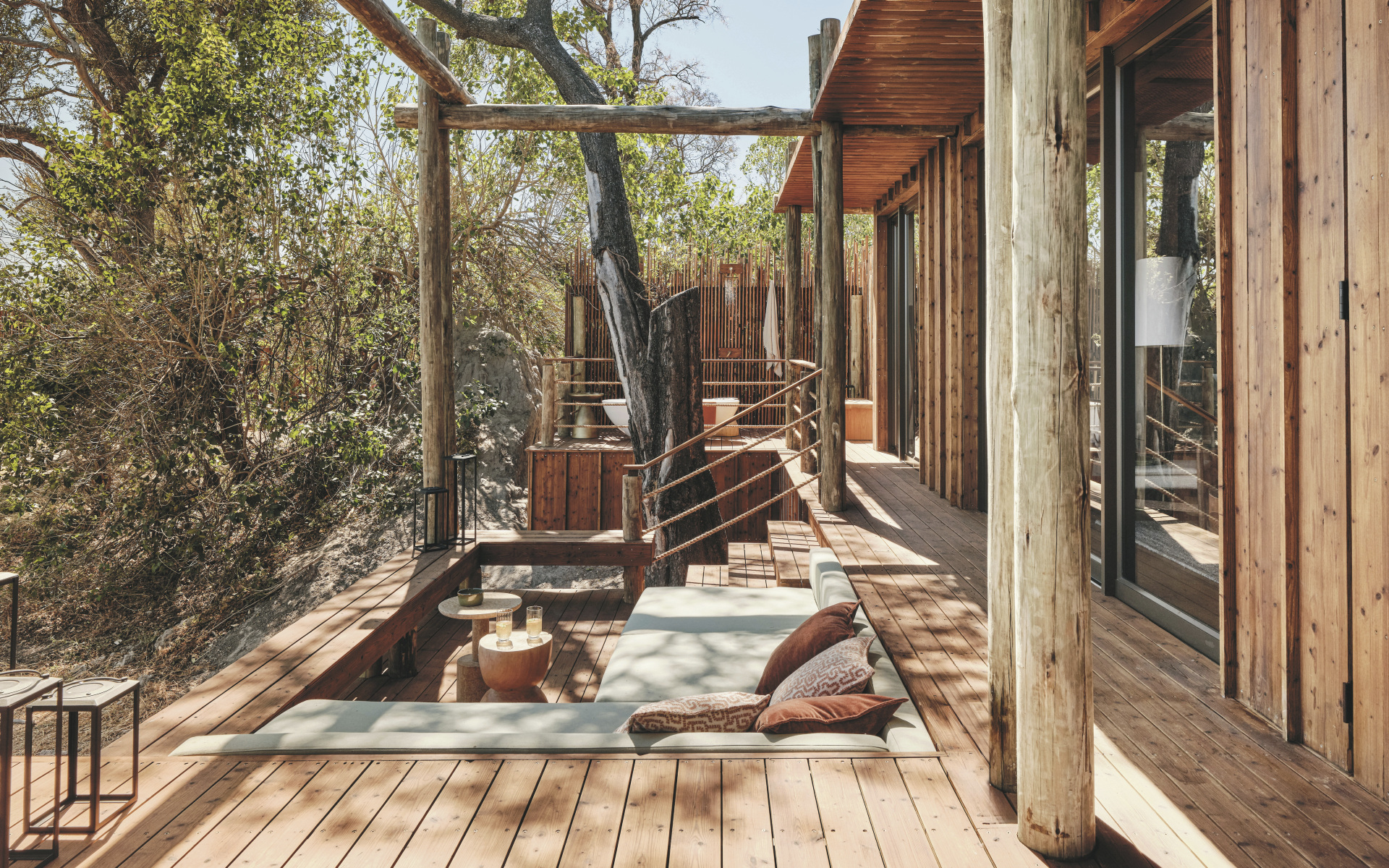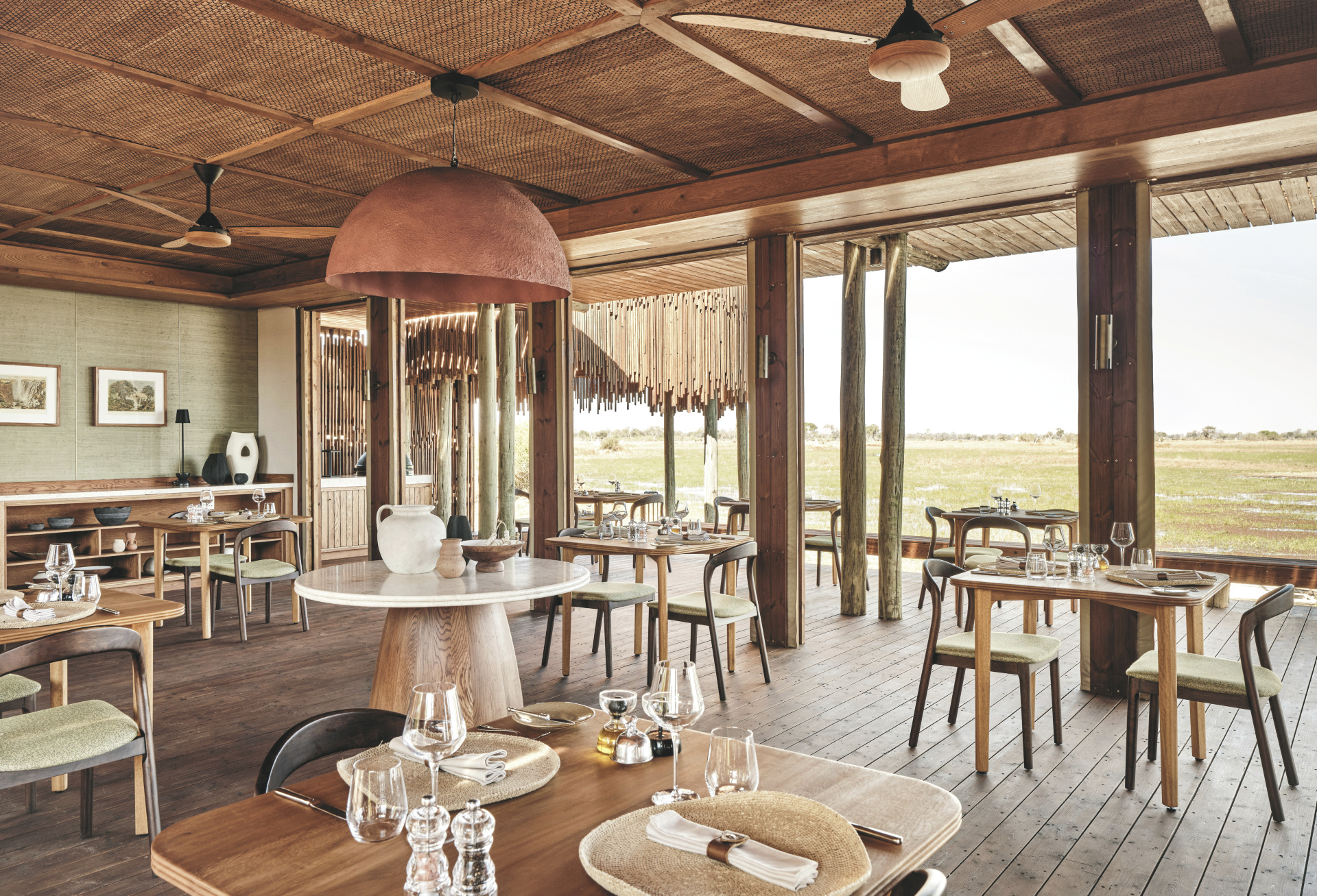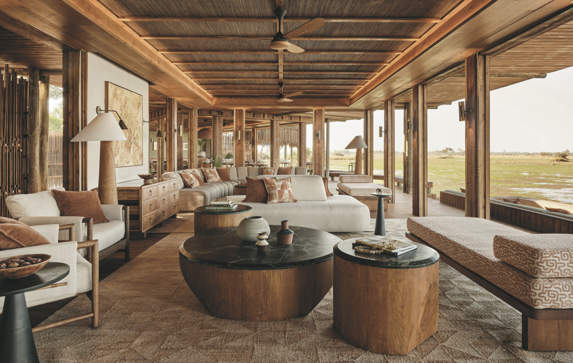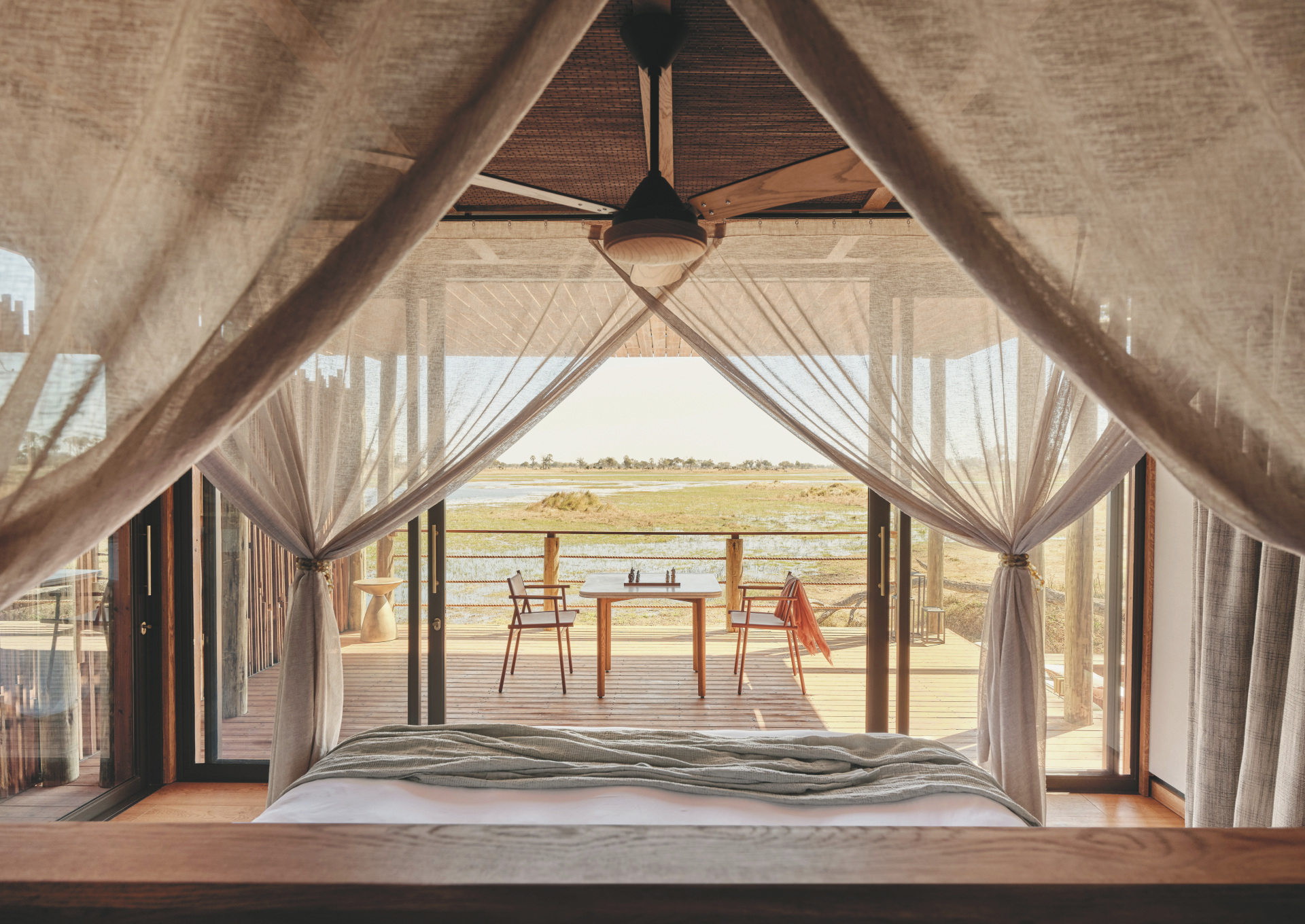 Jede der 6 Suiten liegt erhöht über den Feuchtgebieten und ist so gestaltet, dass sie maximale Privatsphäre bietet. Helle, luftige Schlafzimmer öffnen sich zu geschwungenen Terrassen mit Blick auf den Boro Fluss und das Okavango Delta, während große Fenster die Außenwelt nach innen holen. Neben Deckenventilatoren und Moskitonetzen verfügen die Suiten jeweils über eine Außendusche und ein Star Bath, für ein traumhaftes Bad zwischen schimmerndem Wasser und funkelnden Sternen am Himmel.