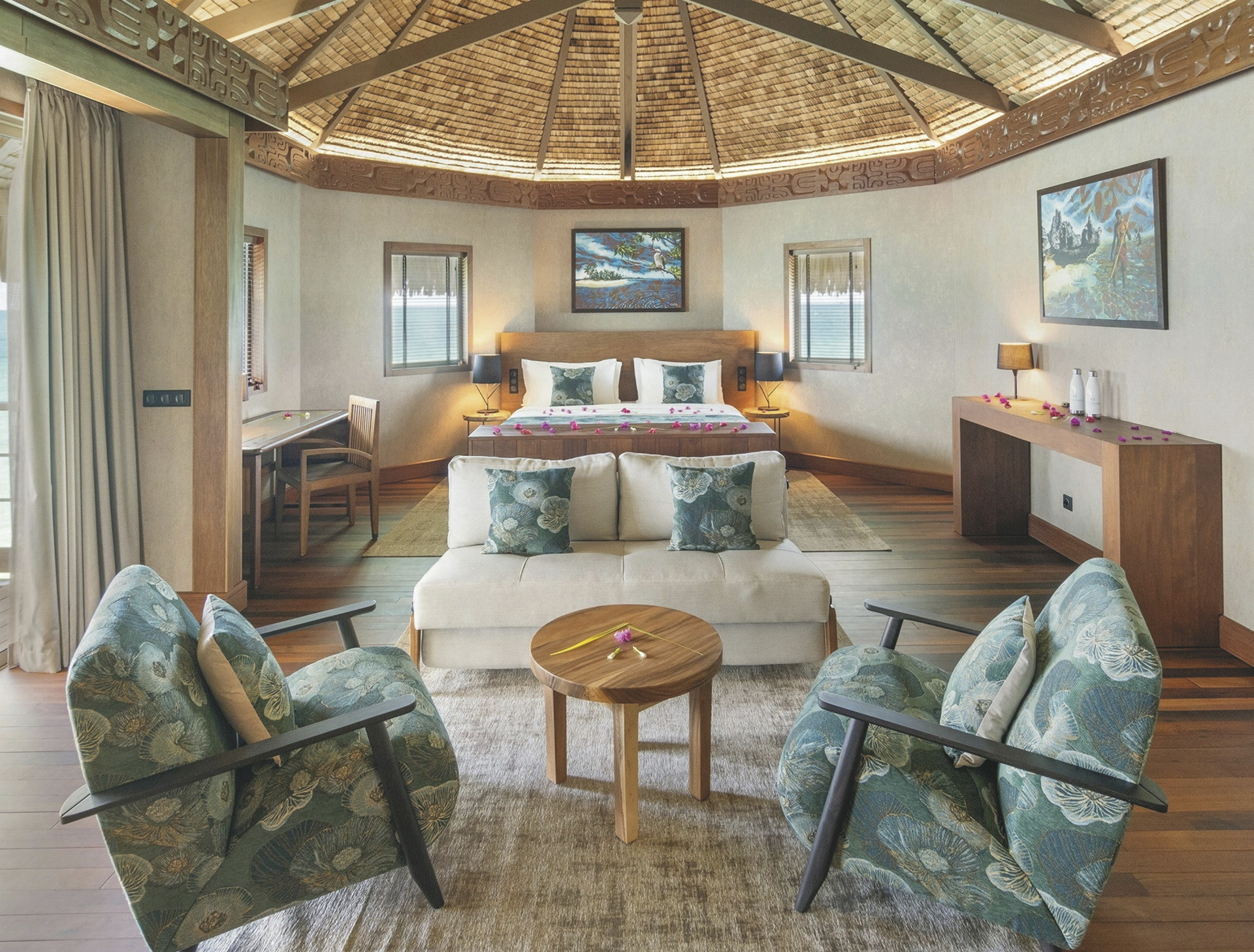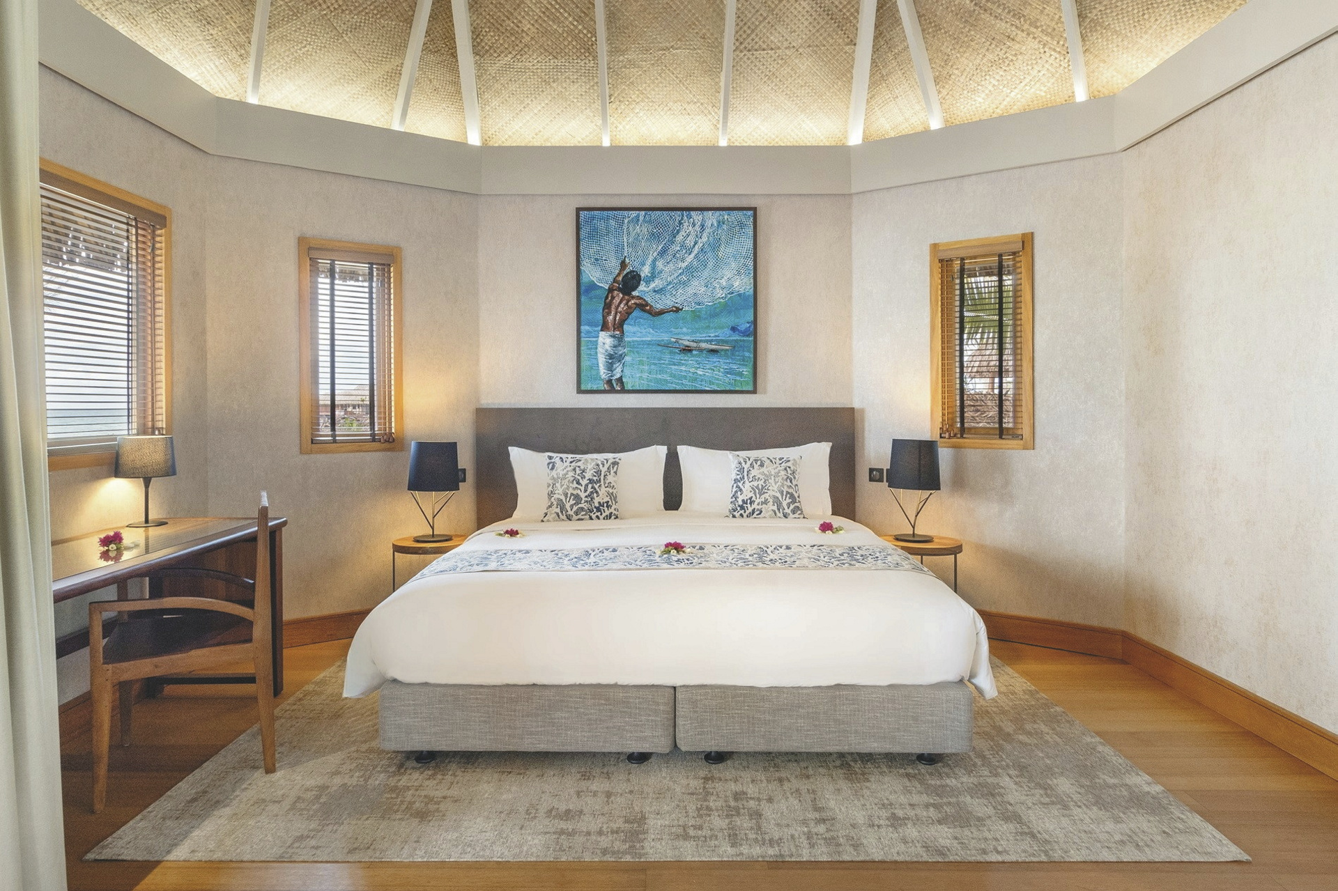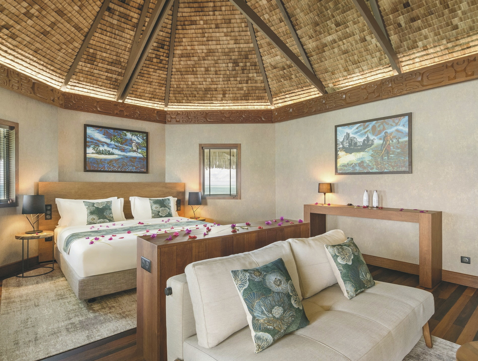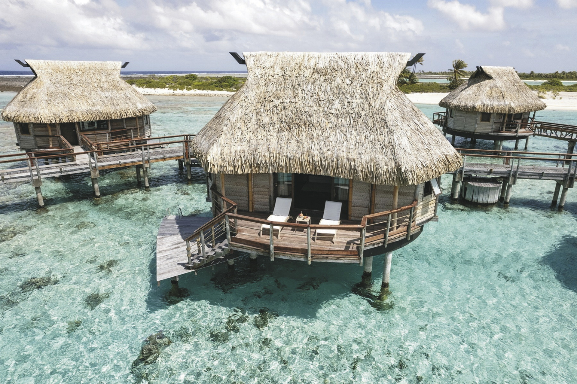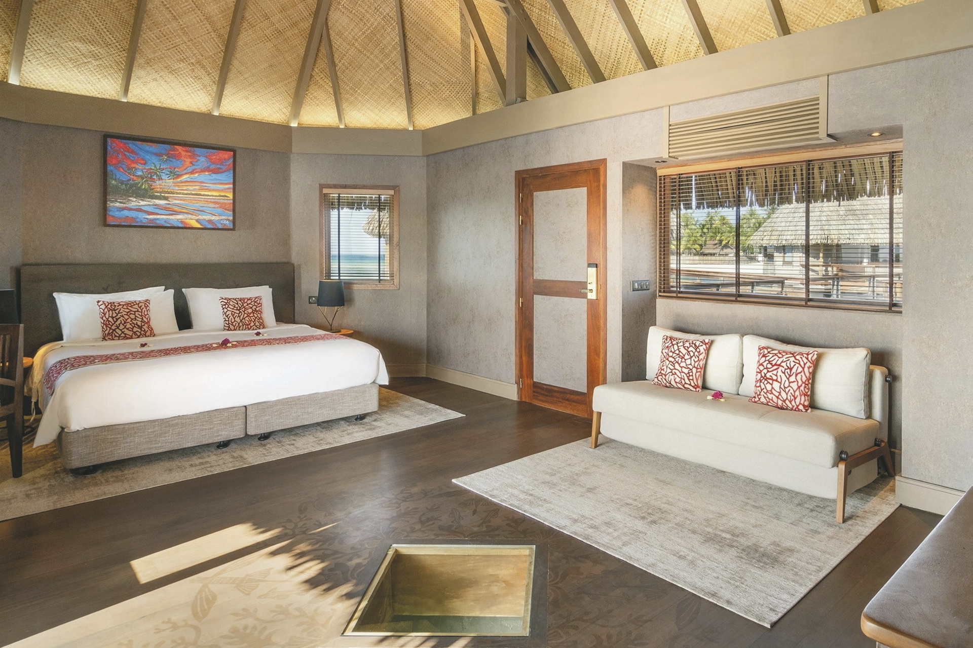 Alle 29 Bungalows sind im polynesischen Design gehalten und bieten gleichzeitig hohen Komfort und neueste Technik.Sie sind klimatisiert, verfügen über Terrasse mit Sonnenliegen, Minibar (täglich Nachschub), Nespresso Kaffeemaschine, Telefon, TV., Safe, Bügeleisen, ein luxuriöses Badezimmer mit Dusche. Durch das Glasfenster im Boden der Overwater-Bungalows können Sie die bunten Fische in der Lagune beobachten. Premium Overwater-Bungalows bieten zusätzlich Zugang zum Meer. Overwater-Suiten bieten viel Platz und im Bad zusätzlich eine Badewanne.
